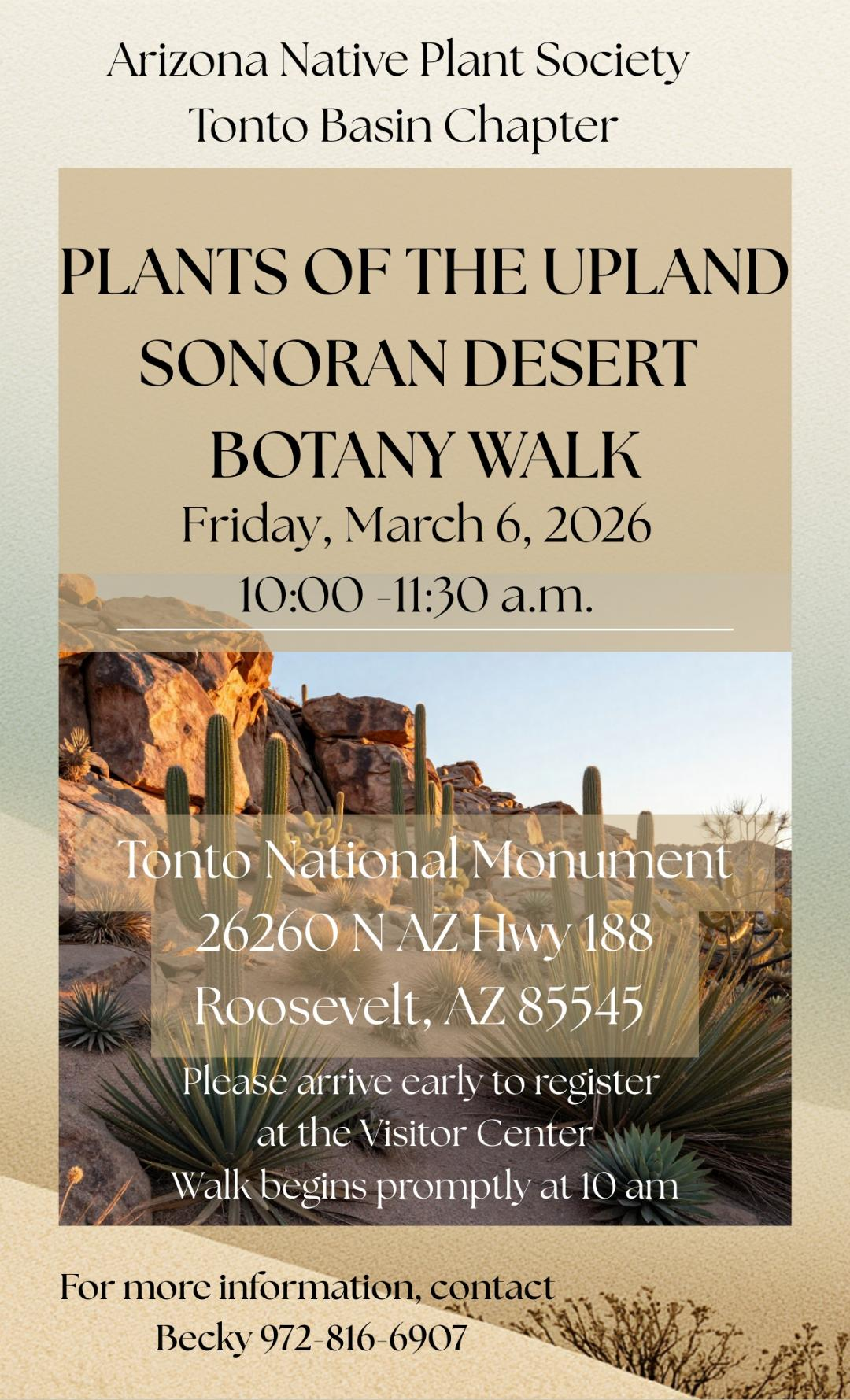 See and learn about Sonoran Desert upland plants on a a botany walk hosted by the Tonto Basin Chapter of the Arizona Native Plant Society March 6, Friday, at Tonto National Monument. Please arrive early to register at the visitor center, as our walk begins promptly at 10:00.